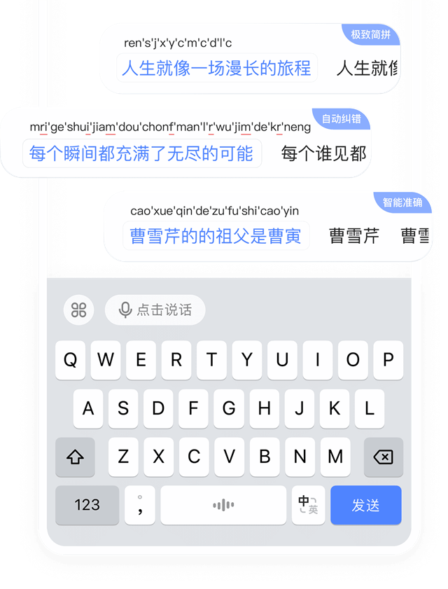 提供了9键、26键、26键双拼、手写的键盘输入方式。有强大的纠错和简拼能力。推荐大家尝试长句的输入,准确率翻倍!