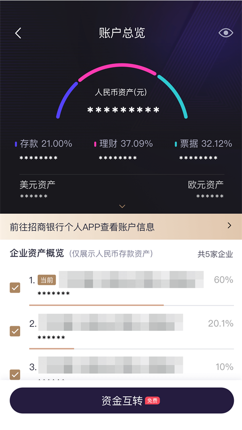 3、多层级账户管理:允许企业设置不同操作员的查询、转账及审批额度权限,权限变更可在APP内一键提交银行审核。