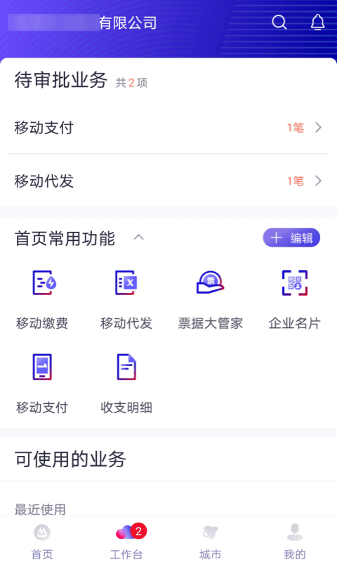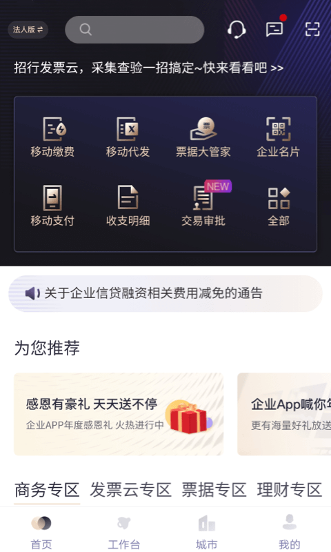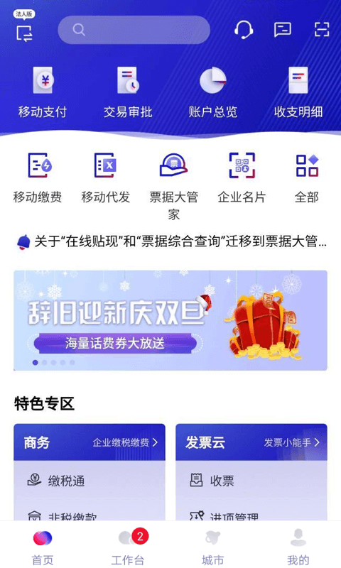 5、综合服务:包括电子票据(汇票签收、背书、贴现)、税费缴纳(支持个税、增值税及社保)、预约取现及对公理财申购。