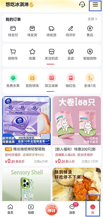1、打开抖音商城app,进入【我】的界面,点击右上角三横线标识。