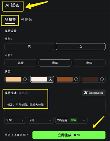 打开可灵AI→ 进入「AI试衣」模块,在「AI模特」输入你想生成的虚拟模特长相