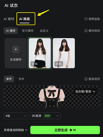 拥有了心仪的模特,下一步就是施展换装魔法!点击「AI换装」功能。