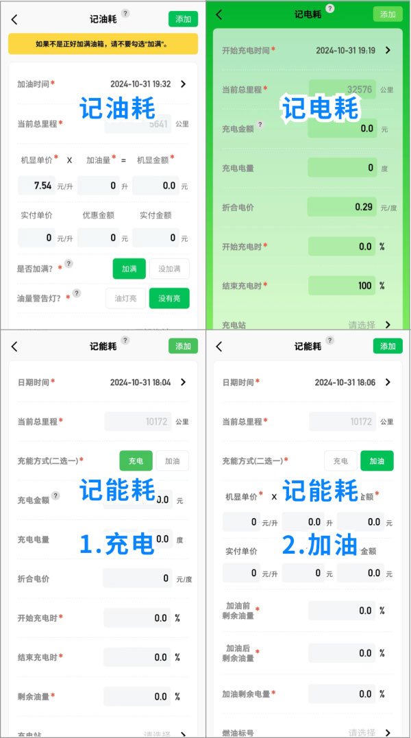 充能方式如果充电就选「充电」,如果加油就选「加油」,下面的输入项会不同。