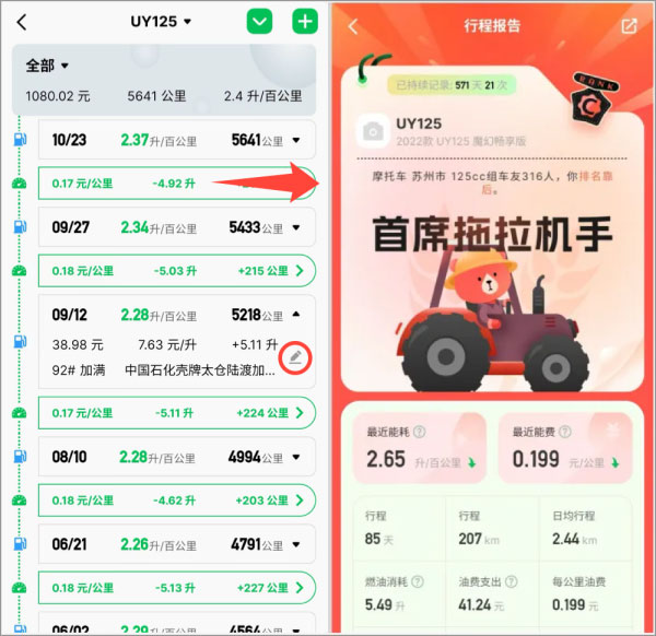 - 电动车:按充电量 + 剩余电量百分比测算电耗,换算成每公里成本,一目了然。