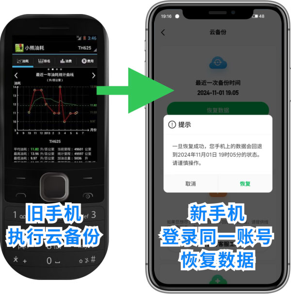 新手机上安装小熊油耗app并用原有账号登录,然后恢复数据:我的-备份/恢复-恢复数据。