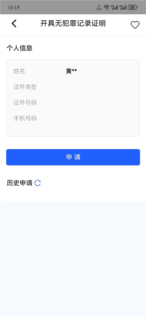 2、进入申请页面。如果你已经在这个App注册过,你的身份信息就已经保存下来了,一个字都不用输入直接点“申请”就进入下一步。如果是第一次使用,需要先注册、登录,然后再“申请”。