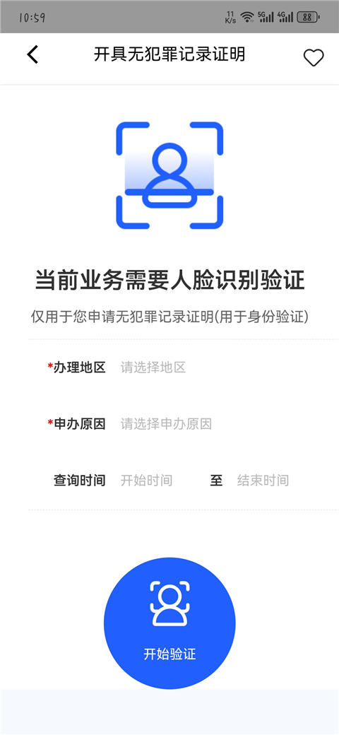 3、这一步需要进行人脸识别验证。首先要选择办理地区、申办原因和查询时间。其中的受理地类型可以是“户籍地”也可以是“居住地”,目前涵盖的地区包括北京、天津、江西、广西和四川,希望以后所有省市区都能“通办”!查询时间最好是从出生时间到现在。全部选好后点“开始验证”。