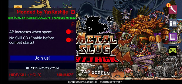 合金弹头进攻破解版是一款以SNK经典街机IP《合金弹头》为背景创作的策略攻防手游。此版本为破解版,玩家可获得无限勋章。并且内置mod菜单供玩家使用。玩家将不再直接操控角色横版闯关,而是化身为指挥官,通过收集、培养原作中登场的正规军、叛军、火星人等多种单位,组建阵容,在棋盘格般的战场上展开自动战斗与技能释放的战术对决。作为一款以SNK经典街机IP《合金弹头》为背景创作的策略攻防手游,。它用熟悉的像素角色唤醒童年记忆,又用足以钻研百小时的阵容克制、合体技、无体力限制等设计,撑起中长线游玩价值。无论你是渴望在通勤路上重温