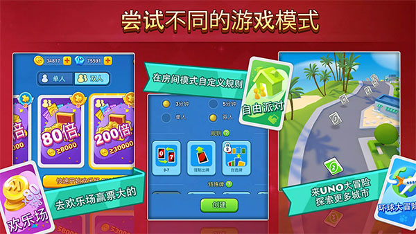 2、经典+创新玩法:保留原版规则的基础上,加入“UNO 50&双人模式等趣味变体,以及主题表情、卡背特效。