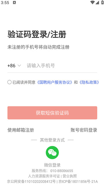 选择“验证码登录或注册”后输入手机号码、验证码,并勾选“已阅读并同意服务协议、隐私政策”后完成注册。