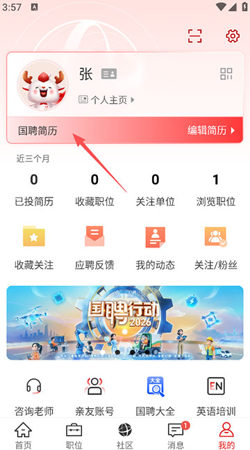 点击上方“编辑简历”进行个人简历编辑。完成后即可进行求职招聘。