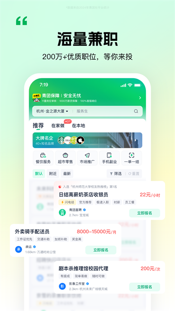 带有保险特殊标识的兼职,在录取后,您将自动获得青团社为您购买的“平安银行” 兼职意外险(最高10万元理赔),我们用心为您服务,助您安心做兼职。