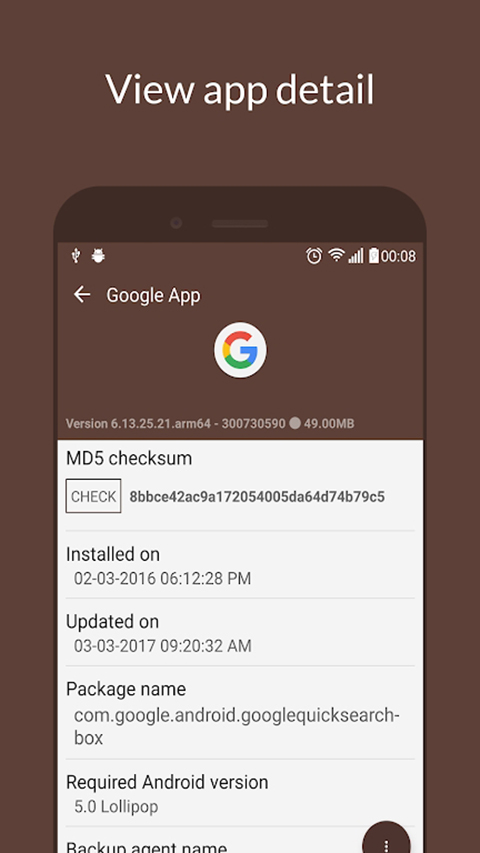 4、 安装包校验功能:自动计算APK文件的MD5值与原应用进行比对,确保提取出的文件完整可用,避免损坏。